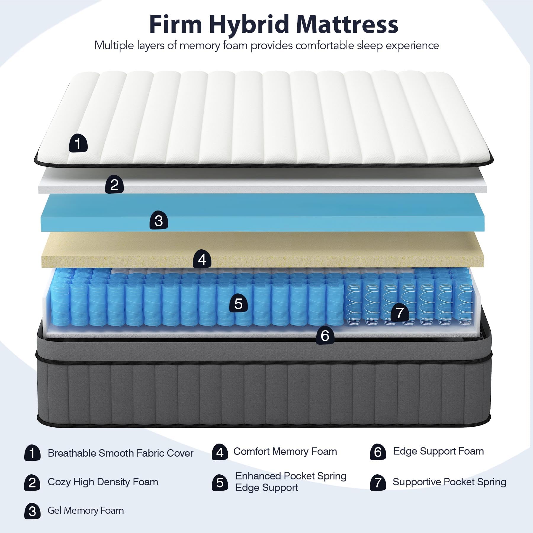- Enhanced Edge Support —— The full size hybrid mattress is built with reinforced edge support using three layers of coils. This firm 10 inch full mattress offers superior stability and prevents sagging, ensuring long-lasting durability and consistent comfort across the entire surface.Made with gel memory foam, this mattress is designed to help keep you cool and comfortable throughout the night